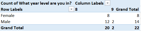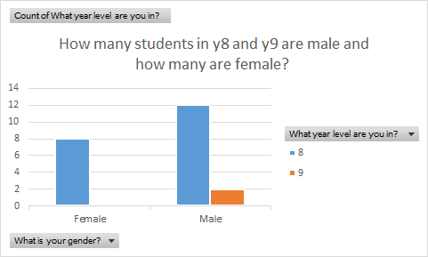 The graph above shows that there were more males that took the survey than females. In one class of year 8’s and 9’s there are 8 year 8 females and 12 year 8 males and 2 year 9 males.